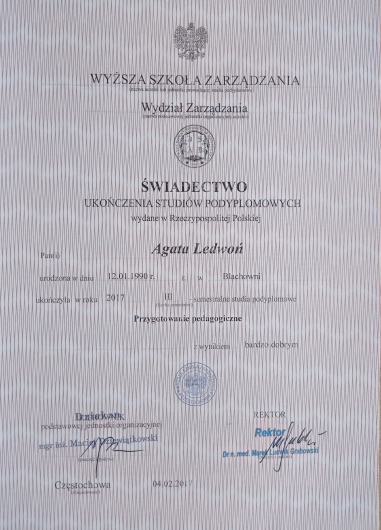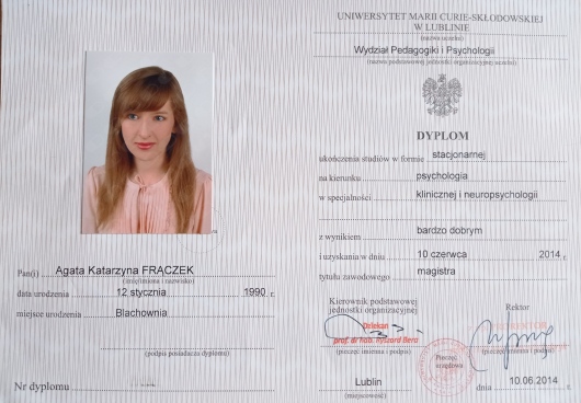 Ukończyłam 5 letnie studia na kierunku psychologia – specjalność kliniczna i neuropsychologia na Uniwersytecie Marii Curie-Skłodowskiej w Lublinie, całościowy 4 letni kurs psychoterapii w nurcie Transkulturowej Psychoterapii Pozytywnej we Wrocławskim Instytucie Psychoterapii, 1,5 roczne studia podyplomowe z zakresu Diagnozy i Terapii Neuropsychologicznej (UMCS, Lublin), 1,5 roczne studia podyplomowe z zakresu Przygotowania Pedagogicznego w Wyższej Szkole Zarządzania w Częstochowie oraz liczne specjalistyczne kursy z zakresu pomocy psychologicznej i psychoterapii.