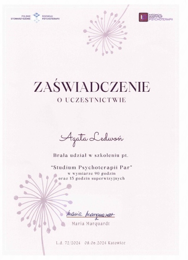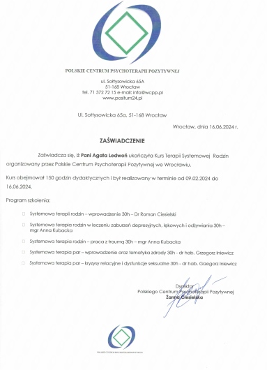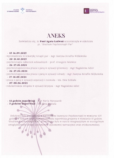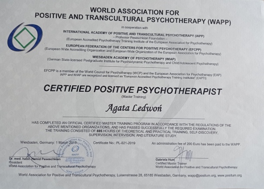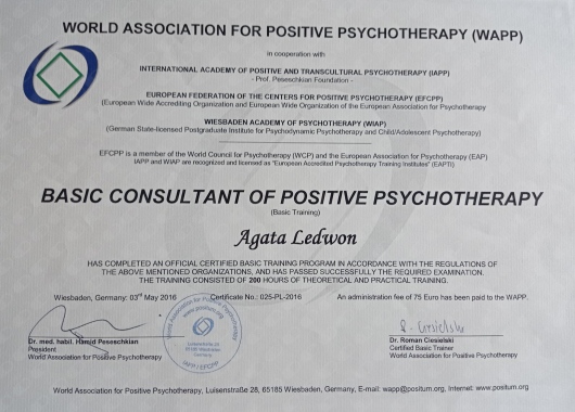 Swoją pracę poddaję regularnej superwizji u certyfikowanego superwizora w Polskim Centrum Psychoterapii Pozytywnej we Wrocławiu.