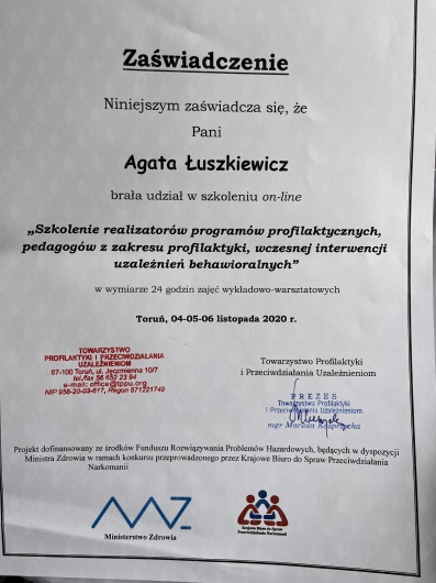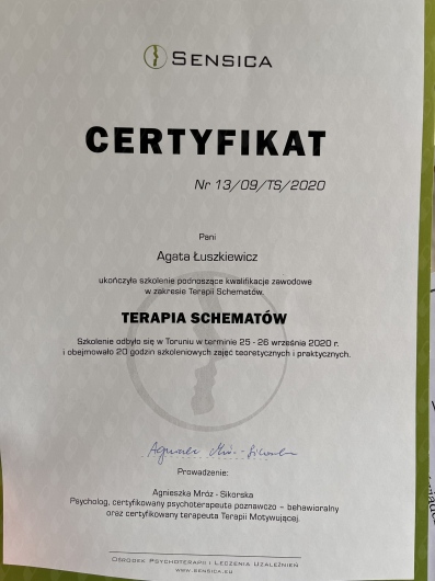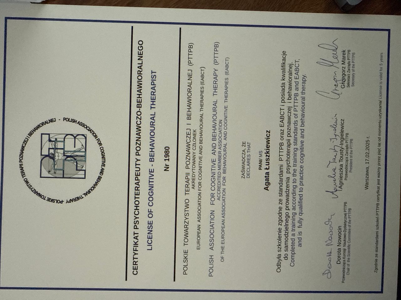 Ukończyłam 4letnie szkolenie w nurcie poznawczo-behawioralnym w Instytucie Poznawczym – ośrodku posiadającym akredytację Polskiego Towarzystwa Psychoterapii Poznawczo-Behawioralnej.