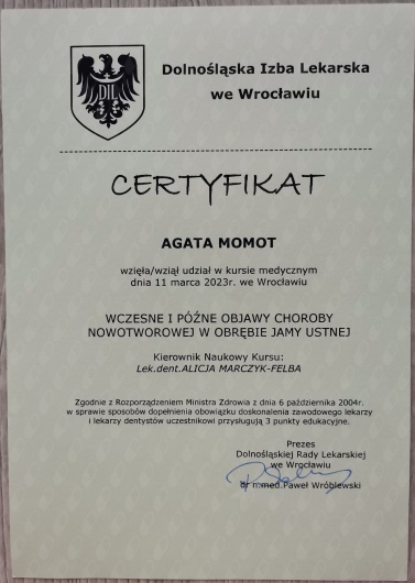 Jestem dyplomowaną higienistką stomatologiczną z ponad 5-letnim doświadczeniem. Wykonuję zabiegi profilaktyczne, takie jak skaling (usuwanie kamienia), piaskowanie (usuwanie osadów) i fluoryzację. Dodatkowo przeprowadzam instruktaże szczotkowania i nitkowania zębów, dobierając odpowiednie akcesoria, indywidualnie do każdego pacjenta. Jestem absolwentką kierunku Zdrowie Publiczne na Uniwersytecie Medycznym we Wrocławiu. Zdobyte wykształcenie i doświadczenie, pomaga mi patrzeć na pacjenta holistycznie. Nie skupiam się jedynie na zębach, ale też edukuję pacjentów o wpływie higieny jamy ustnej na cały organizm człowieka. Wiedzę przekazuję w przystępny sposób, tak by pacjenci byli świadomi wagi profilaktyki stomatologicznej. W gabinecie zapewniam komfort, swobodną atmosferę i pełen profesjonalizm. Z cierpliwością przyjmuję pacjentów z dentofobią i dzieci. Poza pracą poszerzam swoją wiedzę i uczestniczę w szkoleniach, tak by ciągle się rozwijać.