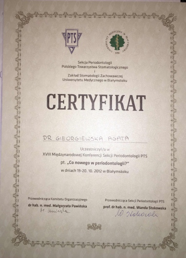 Jaki jest zakres porad oferowanych przez Agata Orzechowska?Agata Orzechowska to periodontolog. Na podstawie swojego doświadczenia i wykształcenia Agata Orzechowska oferuje usługi takie jak: Konsultacja periodontologiczna, konsultacja implantologiczna, konsultacja chirurga stomatologicznego, Usunięcie zmiany błony śluzowej, Konsultacja stomatologiczna, konsultacja stomatologiczna dzieci.