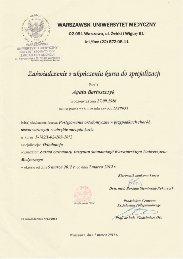 Jestem specjalistą ortodoncji. Ukończyłam studia na wydziale lekarsko- dentystycznym Uniwersytetu Medycznego w Lublinie . Po rocznym stażu podyplomowym odbyłam 4-letnie szkolenie specjalizacyjne w Wojewódzkiej Przychodni Stomatologicznej w Krakowie zakończone najlepiej zdanym w Polsce Państwowym Egzaminem Specjalizacyjnym.