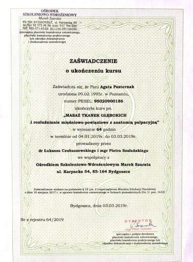 Jaki jest zakres porad oferowanych przez Agata Pasternak?Agata Pasternak to fizjoterapeuta. Na podstawie swojego doświadczenia i wykształcenia Agata Pasternak oferuje usługi takie jak: konsultacja fizjoterapeutyczna, fizjoterapia, Terapia manualna, Drenaż Limfatyczny Manualny, Trening medyczny, Masaż Pneumatyczny.