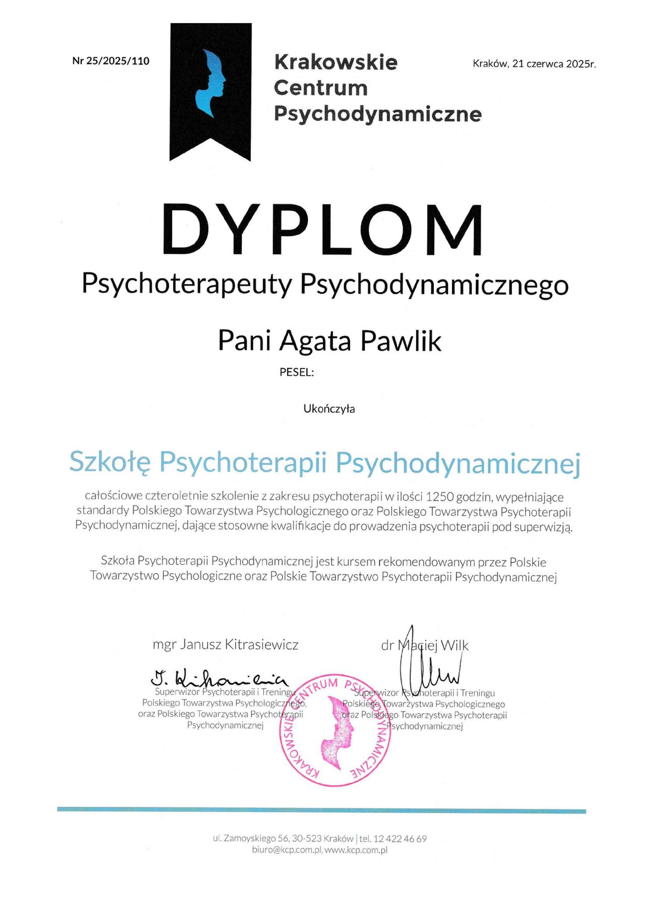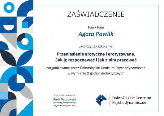 Jestem psychologiem oraz dyplomowanym psychoterapeutą psychodynamicznym. Ukończyłam 5-letnie studia magisterskie z psychologii o specjalności klinicznej oraz 4-letnią szkołę psychoterapii (Krakowskie Centrum Psychodynamiczne). Jestem w trakcie dwuletniej specjalizacji z metody TFP (Terapia Skoncentrowana na Przeniesieniu). Obecnie prowadzę psychoterapię indywidualną osób dorosłych w gabinecie prywatnym oraz w Poradni w ramach NFZ - Centrum Zdrowia Psychicznego.