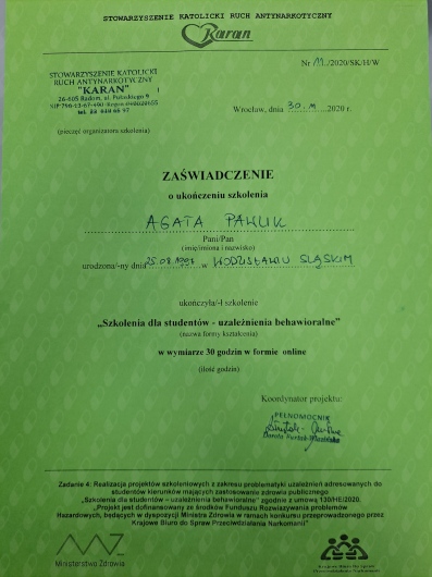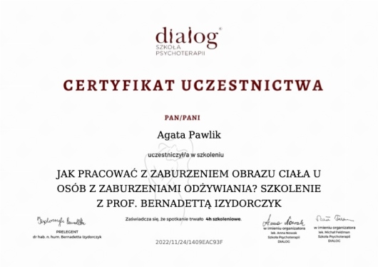 Nieustannie poszerzam swoją wiedzę i umiejętności, uczestnicząc w licznych szkoleniach oraz konferencjach naukowych. Uczestniczyłam w szkoleniu związanym z pracą z pacjentami chorującymi na zaburzenia odżywiania oraz kursie związanym z leczeniem zaburzeń osobowości narcystycznej zorganizowanym przez Centrum Terapii DIALOG w Warszawie. Wzięłam udział w szkoleniu "Setting w pudełku czyli o psychoterapii psychodynamicznej dzieci" zorganizowanym przez Ośrodek Psychoterapii Mały Książę w Krakowie. Współpracowałam z Centrum Badań Stosowanych nad Zdrowiem i Zachowaniami Zdrowotnymi znajdującym się na Uniwersytecie SWPS we Wrocławiu w którym realizowałam międzynarodowy projekt naukowy CO-CREATE związany z promowaniem aktywności fizycznej oraz zdrowego odżywiania wśród młodzieży. Jestem założycielką Koła Naukowego Zaburzeń Odżywiania i Psychodietetyki CIAŁOŚĆ działającym na Uniwersytecie SWPS.