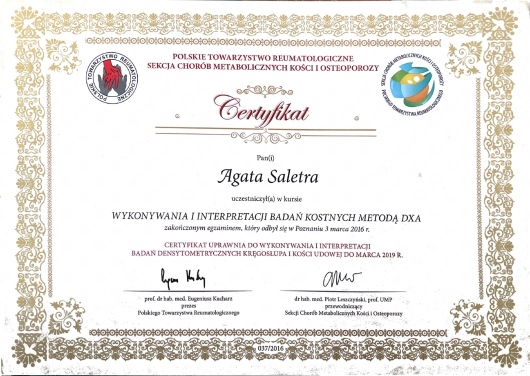 Specjalizuję się w diagnostyce i leczeniu układowych chorób tkanki łącznej, w tym reumatoidalnego i łuszczycowego zapalenia stawów, tocznia rumieniowatego układowego, zespołu Sjögrena, zesztywniającego zapalenia stawów, choroby zwyrodnieniowej, osteoporozy oraz fibromialgii. W pracy klinicznej wykonuję również badania ultrasonograficzne narządu ruchu. Regularnie uczestniczę w kursach i szkoleniach organizowanych przez Polskie Towarzystwo Reumatologiczne (PTR) oraz Polskie Towarzystwo Ultrasonograficzne (PTU), aby stale podnosić swoje kwalifikacje.