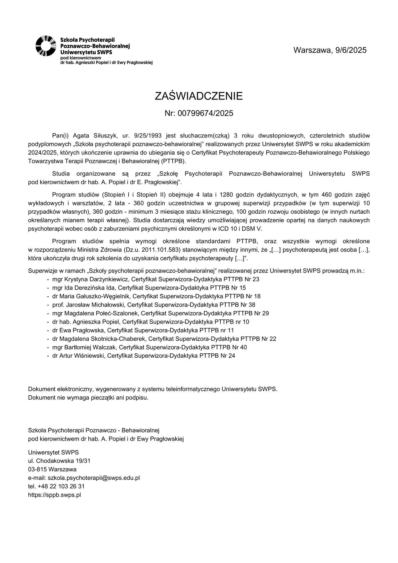 Czy Agata Siłuszyk przyjmuje online, bez konieczności pojawiania się w placówce?Tak, Agata Siłuszyk oferuje konsultacje online. Wybierz opcję „konsultacja online” przy umawianiu wizyty, a zobaczysz dostępne terminy.