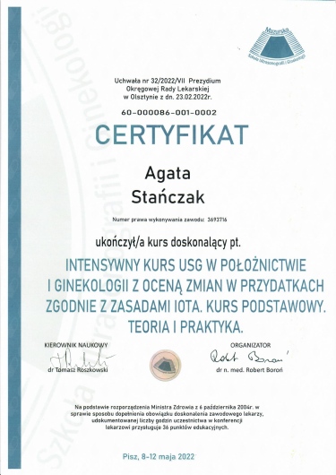 Jestem absolwentką Wydziału Lekarskiego Uniwersytetu Medycznego w Gdańsku. Studia realizowałam w latach 2013-2019. Od 2021 roku odbywam rezydenturę w Klinice Położnictwa i Ginekologii, Ginekologii Onkologicznej i Endokrynologii Ginekologicznej w UCK w Gdańsku.
