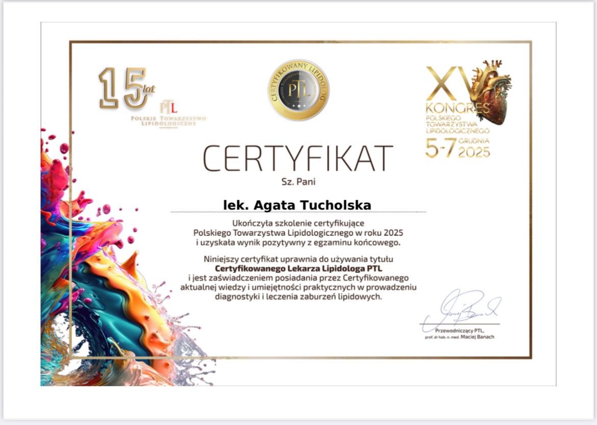 W 2025 r zostałam certyfikowanym lekarzem lipidologiem PTL. Zajmuje się pacjentami z ostrymi schorzeniami kardiologicznymi, pacjentami z niewydolnością serca, chorobą niedokrwienną serca, nadciśnieniem tętniczym, wadami serca, zaburzeniami rytmu, zaburzeniami lipidowymi, pacjentami po operacjach kardiochirurgicznych, a także planowaniem rehabilitacji kardiologicznej. W Poradni Kardiolab wykonuję: - konsultacje kardiologiczne - ekg - echo serca - próby wysiłkowe - Holter EKG - Holter ciśnieniowy