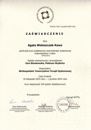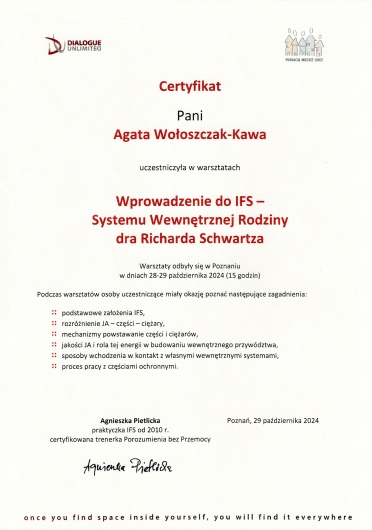 Bardzo serdecznie polecam panią agate wołoszczak kawe dlatego że jej profesjonalność pomogła całej naszej rodzinie i podczas kryzysu uratowała moich rodzicow przed rozwodem