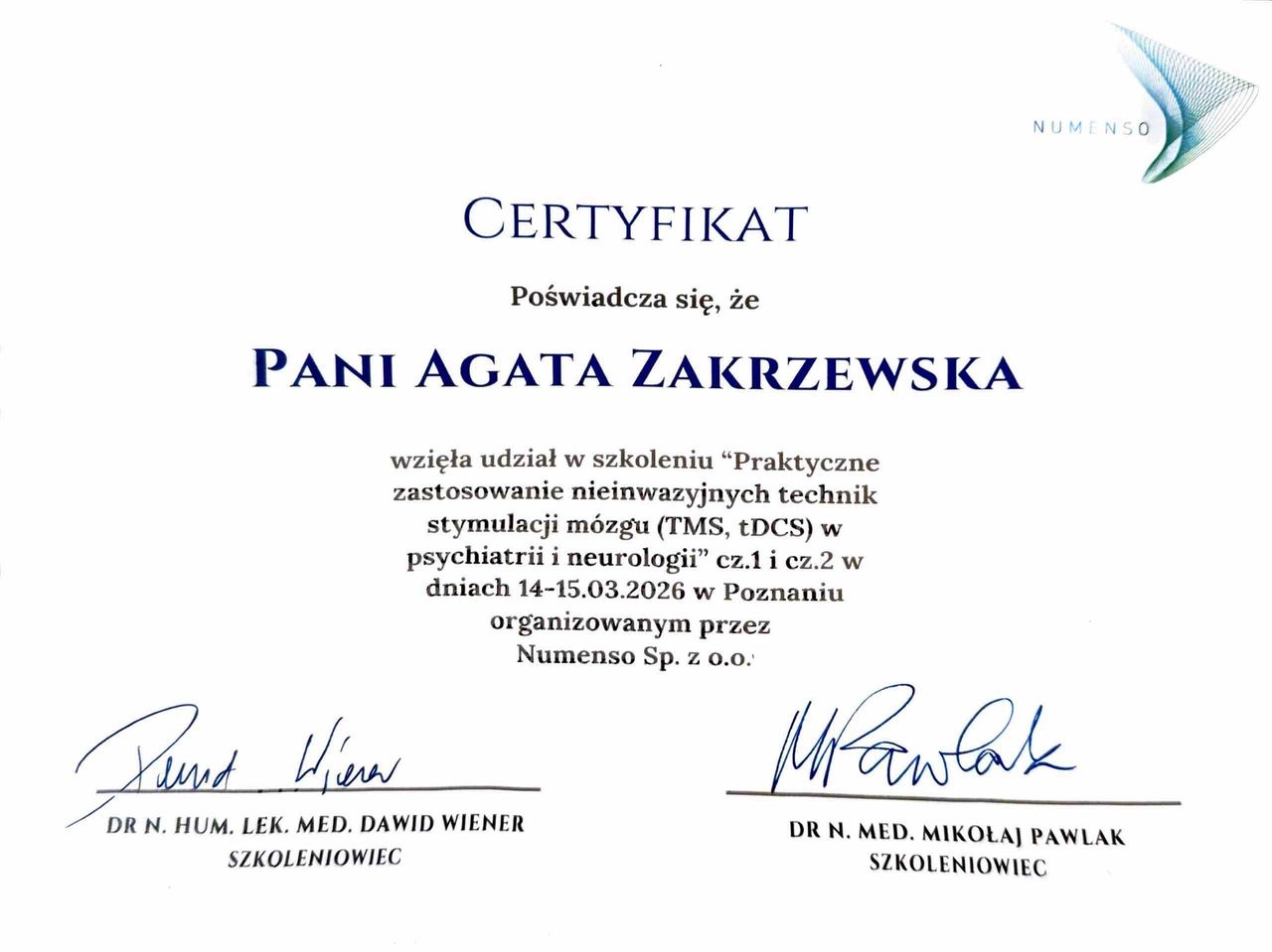 Od marca 2025 roku rozwijam swoje kompetencje w obszarze terapii TMS (przezczaszkowej stymulacji magnetycznej), a od lipca 2025 pracuję jako certyfikowana terapeutka TMS w gabinecie neurostymulacji w Poznaniu, gdzie udzielam terapii TMS opartej o rozmowy ze mną.