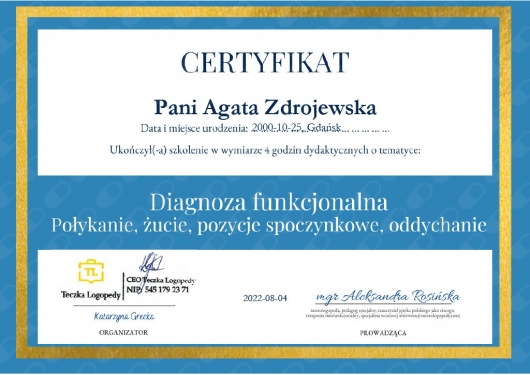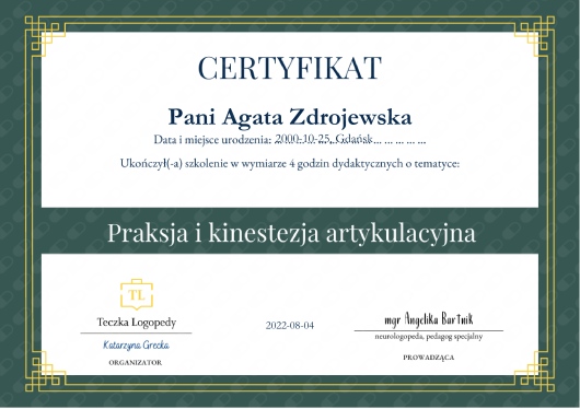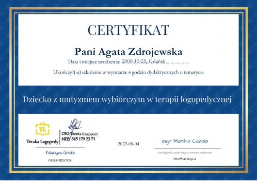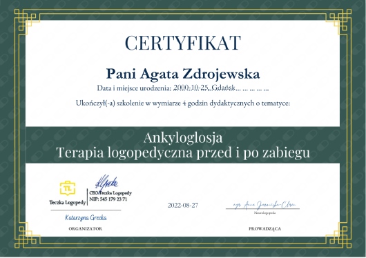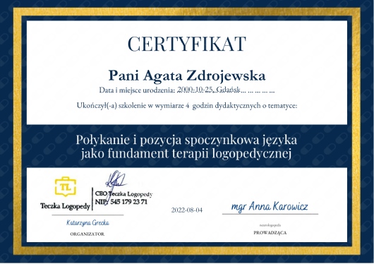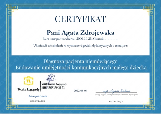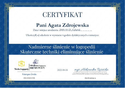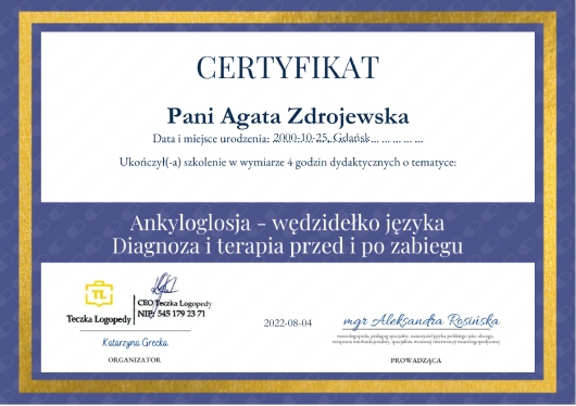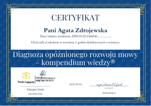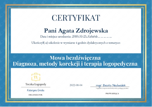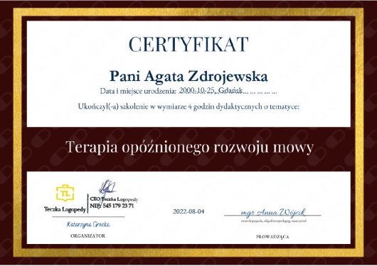 Serdecznie polecam terapię logopedyczną u Pani Agaty! Jest to przesympatyczna osoba, pełna empatii, profesjonalizmu i zaangażowania. Dzięki jej indywidualnemu podejściu i ciepłej atmosferze, każdy może poczuć się komfortowo i zmotywowany do pracy nad swoją wymową. Postępy, jakie osiągnąłem podczas spotkań, przerosły moje oczekiwania. Kto by pomyślał, że grubo po 30-tce można nauczyć się mówić bardziej poprawnie :)