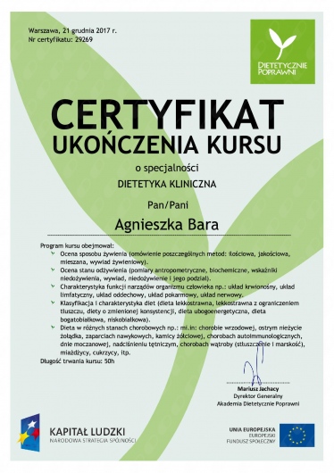 Jestem specjalista w zakresie dietetyki klinicznej. Swoją wiedze zdobywałam w trakcie studiów na Śląskiej Wyższej Szkole Medycznej w Katowicach. Dietetyka jest moją pasją od kilku lat, i w tym czasie prowadziłam wielu pacjentów. Szczególnie interesuje mnie dietetyka kliniczna oraz profilaktyka otyłości. Podczas każdego spotkania dokładnie omawiamy przebieg planu, rozwiewamy wszelkie wątpliwości które mają Państwo przychodząc do mojego gabinetu, a oprócz standardowego postępowania dietetycznego wykonujemy również analizę składu ciała. Z własnego doświadczenia wiem, że zmiana nawyków żywieniowych oraz stylu życia jest możliwa, dlatego nieustannie poszerzam swoją wiedzę poprzez uczestnictwo w licznych konferencjach naukowych i szkoleniach z zakresu dietetyki, aby wspierać moich pacjentów w realizacji ich celów. Do każdego pacjenta podchodzę z nową energią, pasją, otwartością i zaangażowaniem. Od momentu pierwszego spotkania z moimi pacjentami oraz podopiecznymi staram się przekonać ich że dieta i treningi nie muszą być karą. Nasz styl życia oraz dieta powinna być przyjemnością i możliwością samodzielnego wyboru. Dietetyka to przede wszystkim praca z drugim człowiekiem i za to cenię ją najbardziej. Nigdy nie zalecam pacjentom tego, na co sama bym się nie zdecydowała. Przygotowywałam zindywidualizowane diety dla osób otyłych i w nadwadze, z refluksem żołądkowo-przełykowym, w zespole jelita drażliwego, niedoczynnością oraz nadczynności tarczycy, hashimoto, celiakii, alergiach pokarmowych, cukrzycy, insulinooporności i wielu innych. Równocześnie przygotowując plany treningowe dopasowane do możliwości oraz diety stosowanej przez moich pacjentów oraz podopiecznych. W razie pytań zapraszam do kontaktu.