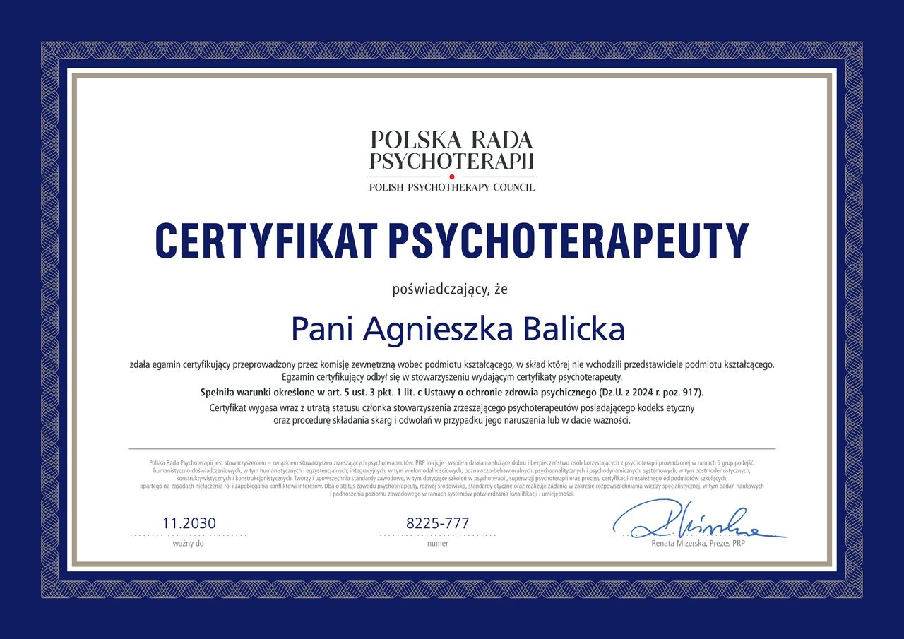 Nazywam się Agnieszka Balicka. Jestem psychologiem i psychoterapeutką. Pracuję z nastolatkami (od 15r.ż.) oraz osobami dorosłymi, które chcą odzyskać spokój, wpływ i jasny kierunek w życiu osobistym lub zawodowym.
