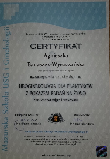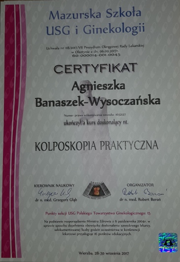 • Certyfikat umiejętności kolposkopowych Polskiego Towarzystwa Kolposkopii i Patofizjologii Szyjki Macicy (PTKPSzM) Członka Europejskiej Federacji Kolposkopii (European Federation for Colposcopy)