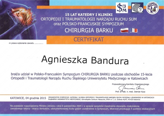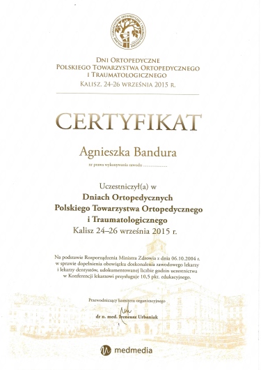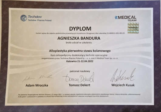 Wiedzę i doświadczenie z zakresu ortopedii i traumatologii stale poszerzam szkoląc się w macierzystym oddziale, podczas pracy na SOR oraz w trakcie krajowych i międzynarodowych sympozjów i kursów o tematyce ortopedycznej i traumatologicznej.