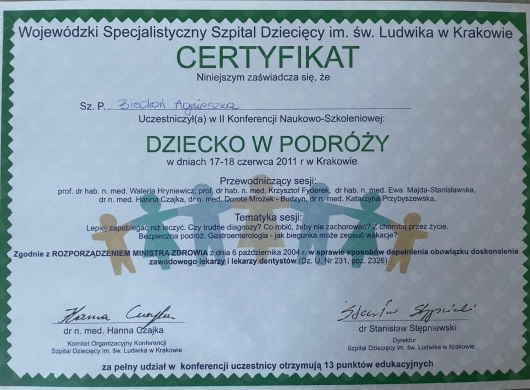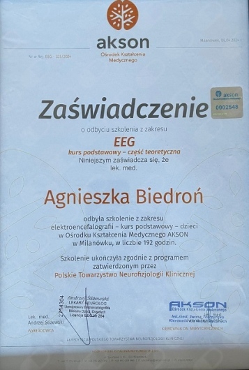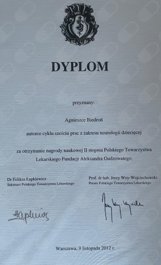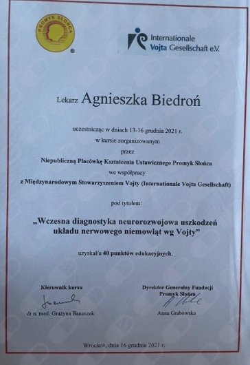 Pani Doktor Agnieszka Biedroń jest lekarzem praktykiem z 20 letnim doświadczeniem, jak również mamą dwójki dzieci, więc doskonale rozumie potrzeby i troski małych pacjentów, jak również ich rodziców. Pani Doktor zajmuje się leczeniem noworodków, niemowląt, dzieci i młodzieży. Posiada dwie specjalizacje z neurologii dziecięcej i pediatrii. Jest przewodniczącą Krakowskiego Oddziału Polskiego Towarzystwa Neurologów Dziecięcych, jak również członkiem Europejskiego Towarzystwa Neurologii Dziecięcej. Pani Doktor studiowała medycynę na Wydziale Lekarskim Collegium Medicum Uniwersytetu Jagiellońskiego w latach 2000-2006. Następnie kontynuowała naukę w ramach studiów doktoranckich CM UJ, co zaowocowało uzyskaniem stopnia doktora nauk medycznych za badania z zakresu neurologii dzieciecej. Od 2007 roku będąc lekarzem w Klinice Neurologii Dziecięcej Uniwersyteckiego Szpitala Dziecięcego w Krakowie, jak również nauczycielem akademickim w Collegium Medicum Uniwersytetu Jagiellońskiego, uczyła studentów polskich i zagranicznych medycyny. Jej wkład w medycynę został doceniony nagrodą naukową Fundacji Aleksandra Gudzowatego Polskiego Towarzystwa Lekarskiego w 2012 roku. Dodatkowo, od 2019 roku jako pierwsza prowadziła pionierski program leczenia rdzeniowego zaniku mięśni (SMA) w Klinice Neurologii Dziecięcej Uniwersyteckiego Szpitala Dziecęcego w Krakowie. Pani Doktor jest autorką / współautorką licznych prac naukowych opublikowanych w czasopismach krajowych i zagranicznych. Obszar działalności w zakresie neurologii dziecięcej i pediatrii obejmuje: diagnostykę i leczenie chorób układu nerwowego, m.in. SMA, tików, bóli głowy, ADHD, padaczki, stwardnienia rozsianego, udarów mózgu, chorób naczyń mózgowych, opóźnienia rozwoju psychoruchowego, zaburzeń napięcia mięśniowego, polineuropatii, miopatii, neurofibromatozy, dystrofii mięśniowych, opis i interpretację wyników badań EEG u dzieci, ocenę prawidłowego rozwoju dziecka, bilans zdrowia dziecka, wizyty patronażowe – pierwsze badanie noworodka, ustalenie planu szczepień ochronnych. Rozmowa z Panią Doktor Agnieszką Biedroń na temat rdzeniowego zaniku mięśni (SMA) w Radio Kraków. https://www.radiokrakow.pl/audycje/SMA-rdzeniowy-zanik-miesni Wywiad z Panią Doktor Agnieszką Biedroń na temat leczenia SMA https://www.fsma.pl/2024/02/rozmowy-o-sma-cykl-wywiadow-z-lekarzami/ Podcast z Panią Doktor Agnieszką Biedroń na temat współpracy hematoonkologa i neurologa dziecięcego w rozpoznaniu i monitorowaniu nerwiakowłókniaków splotowatych w przebiegu neurofibromatozy typu 1. https://onkologia-dziecieca.pl/podcasty/sluchaj/id/1 Ustalona godzina wizyty w gabinecie jest godziną orientacyjną. W przypadku opóźnienia, o kolejności wejścia do gabinetu decyduje kolejność ustalona w grafiku. Opóźnienie może wynikać z potrzeb pacjenta na wizycie poprzedzającej, jak również zależy od tego czy poprzedni pacjent się nie spóźnił.