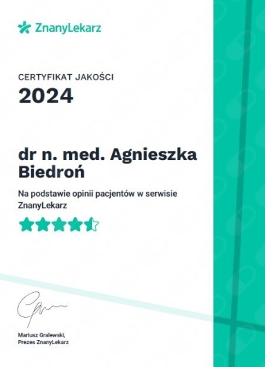 Jak Agnieszka Biedroń umawia wizyty?Agnieszka Biedroń używa kalendarza ZnanyLekarz, dlatego na stronie widzisz aktualne terminy. Wystarczy, że wybierzesz datę i godzinę, które odpowiadają Ci najbardziej. Umawianie wizyty jest darmowe, a tuż przed terminem wyślemy Ci przypomnienie.