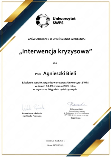 Przez ostatni rok zajmowałam się działalnością psychoedukacyjną. Działałam w fundacji Beztroska Psychoterapia, gdzie zajmowałam się projektowaniem oraz prowadzeniem warsztatów psychoedukacyjnych dla dzieci i młodzieży. Oprócz tego uczęszczałam na liczne szkolenia z zakresu psychologii społecznej, psychologii biznesu, a nawet brandingu i komunikacji wizerunkowej.