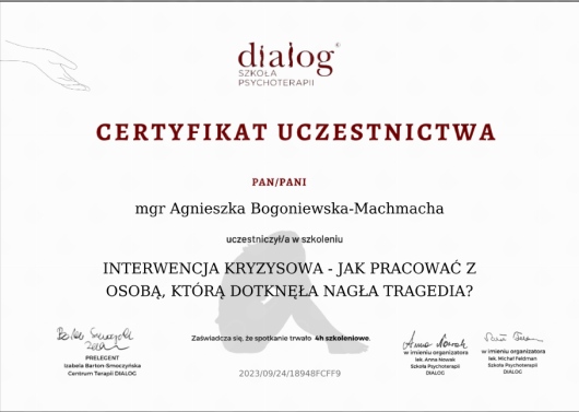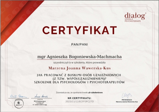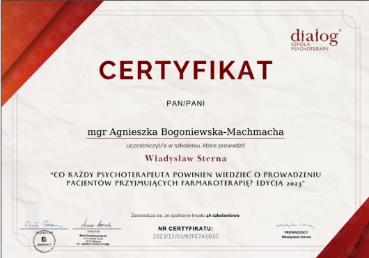 Pani Agnieszka jest bardzo sympatyczna, cierpliwie słuchała o moich problemach, na początku miałam dużo rezerwy ale potem poczułam się bezpiecznie i łatwiej przychodziło mi mówienie o rzeczach o których z nikim nie rozmawiałam. To mi bardzo pomogło! Polecam panią Agnieszkę, potrafi wysłuchać i pomóc.