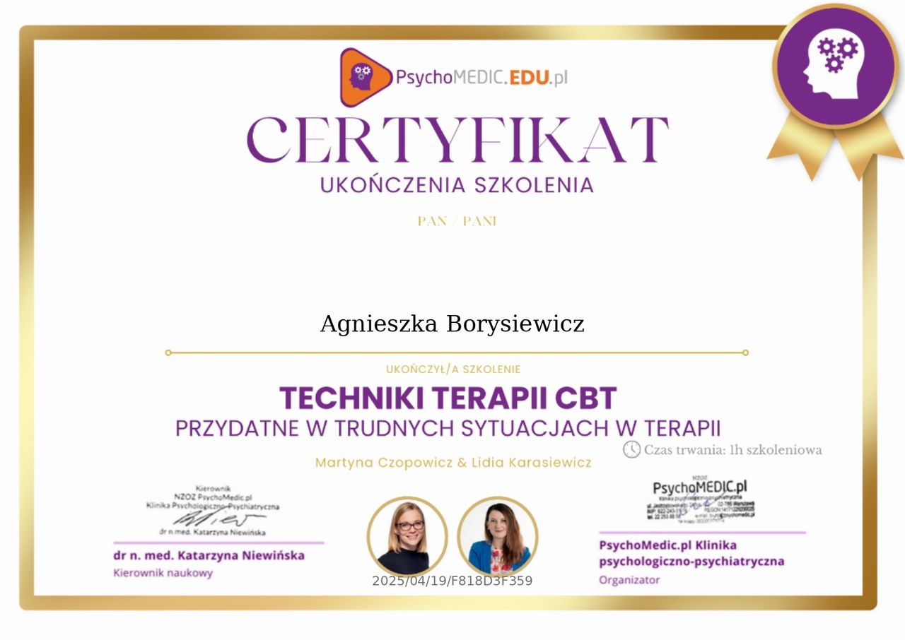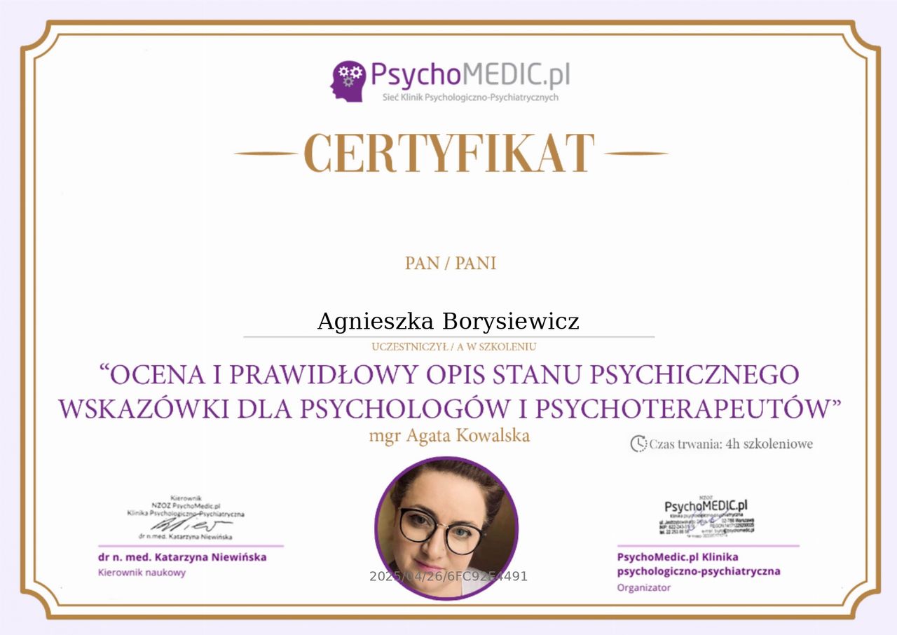 Czy Agnieszka Borysiewicz przyjmuje online, bez konieczności pojawiania się w placówce?Tak, Agnieszka Borysiewicz oferuje konsultacje online. Wybierz opcję „konsultacja online” przy umawianiu wizyty, a zobaczysz dostępne terminy.