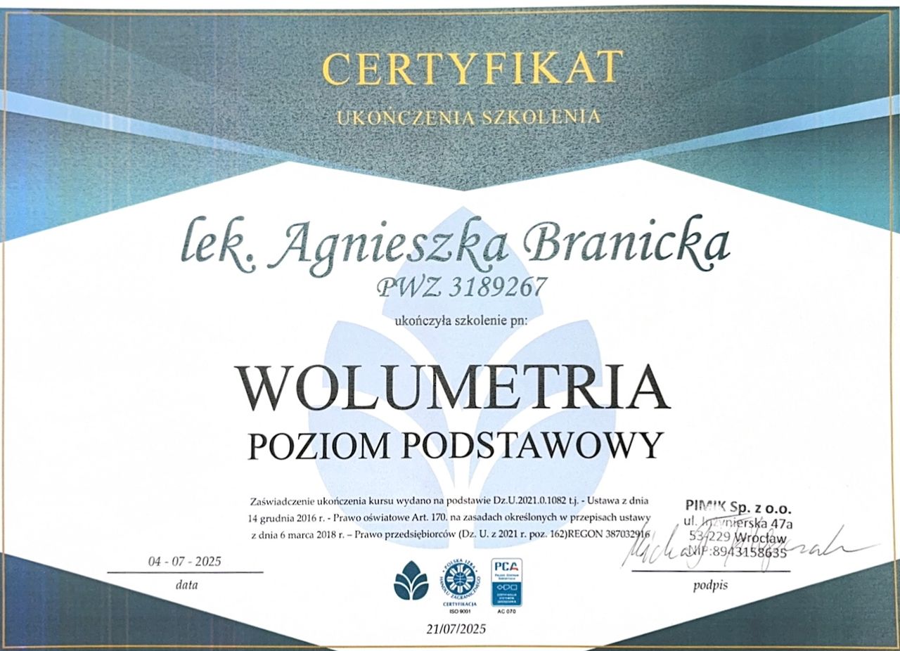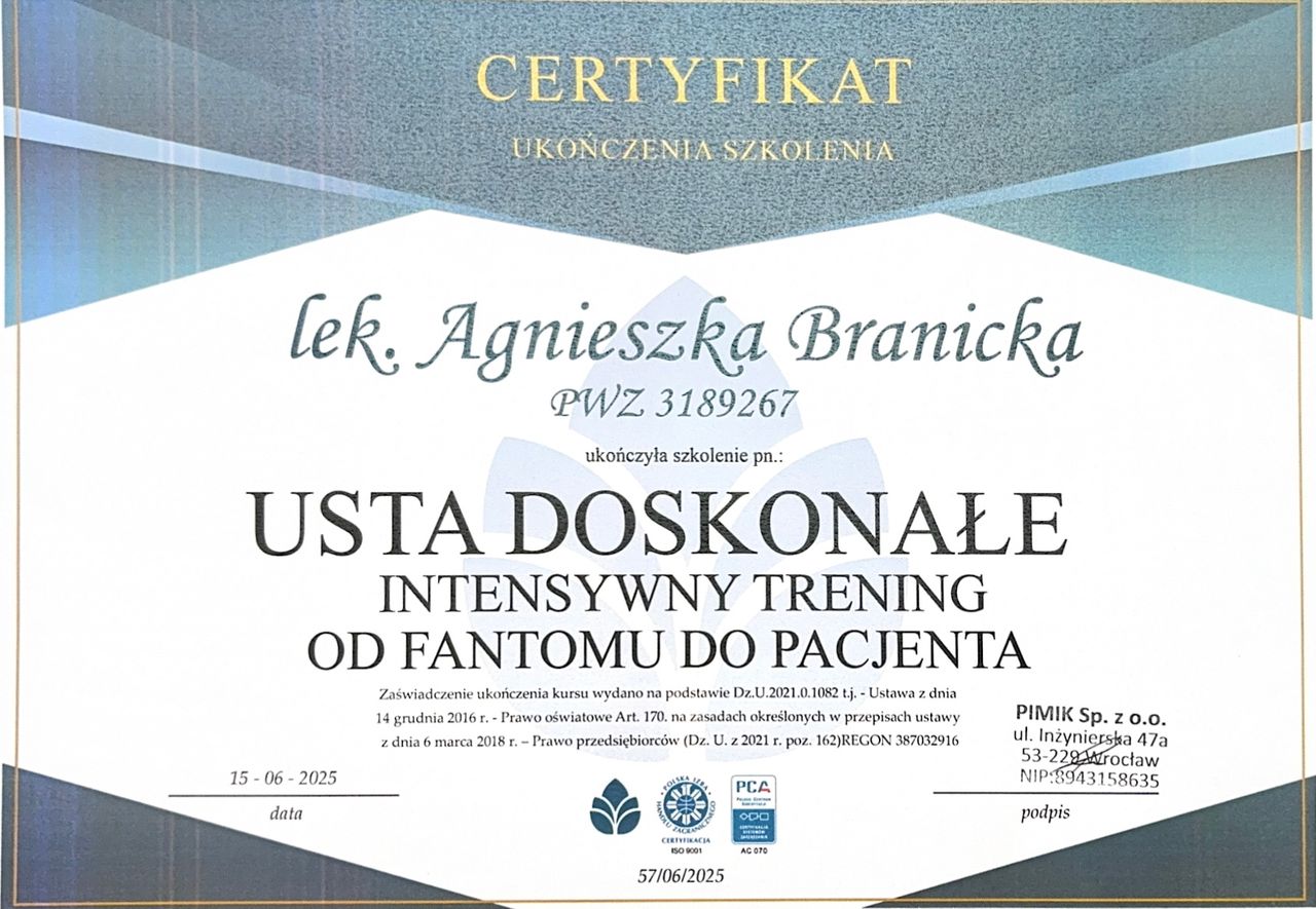 Moja ukończona specjalizacja z medycyny rodzinnej pozwala mi patrzeć na pacjenta całościowo i łączyć wiedzę z różnych dziedzin. Od zawsze fascynowała mnie medycyna estetyczna, dlatego rozwijałam się także w tym kierunku, uczestnicząc w licznych kursach i szkoleniach.