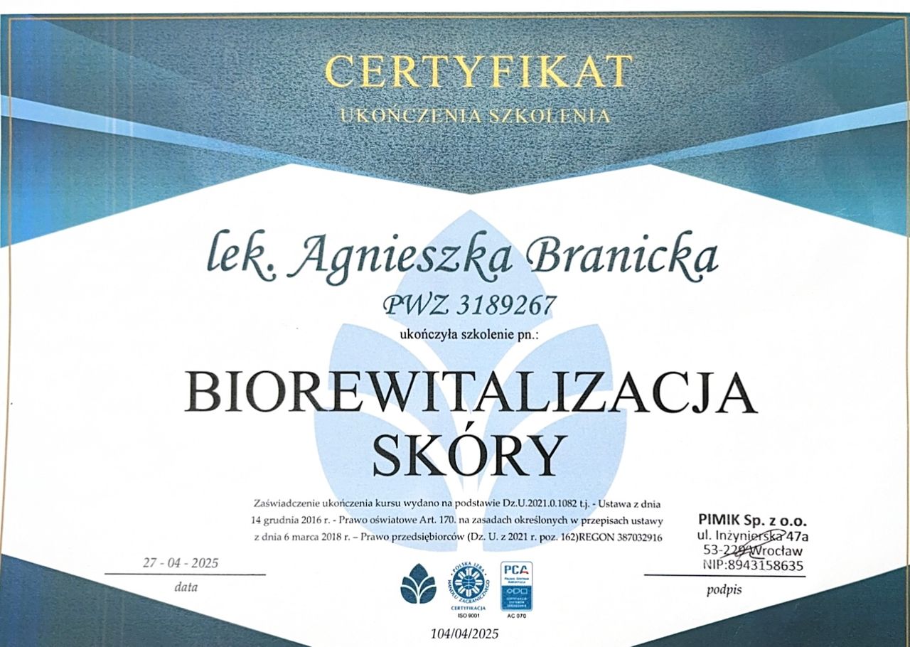 Jestem bardzo zadowolona z wizyty u dr Agnieszki. Zabieg mezoterapii mikroigłowej został przeprowadzony fachowo, w miłej atmosferze – zdecydowanie wrócę na kolejne zabiegi. Pani doktor wszystko dokładnie wyjaśniła i zadbała, żeby zabieg przebiegł bez stresu. Efekty są naturalne, a jednocześnie naprawdę widoczne.