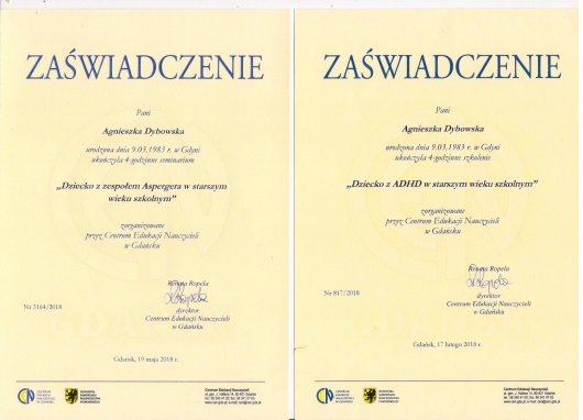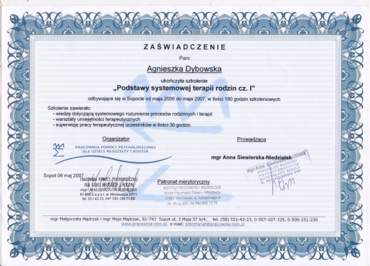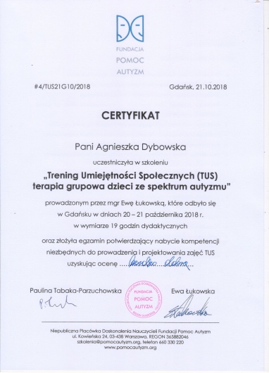 Przeszłam szkolenie z zakresu Terapii Skoncentrowanej na Rozwiązaniu, Treningu Zastępowania Agresji oraz Treningu Umiejętności Społecznych.