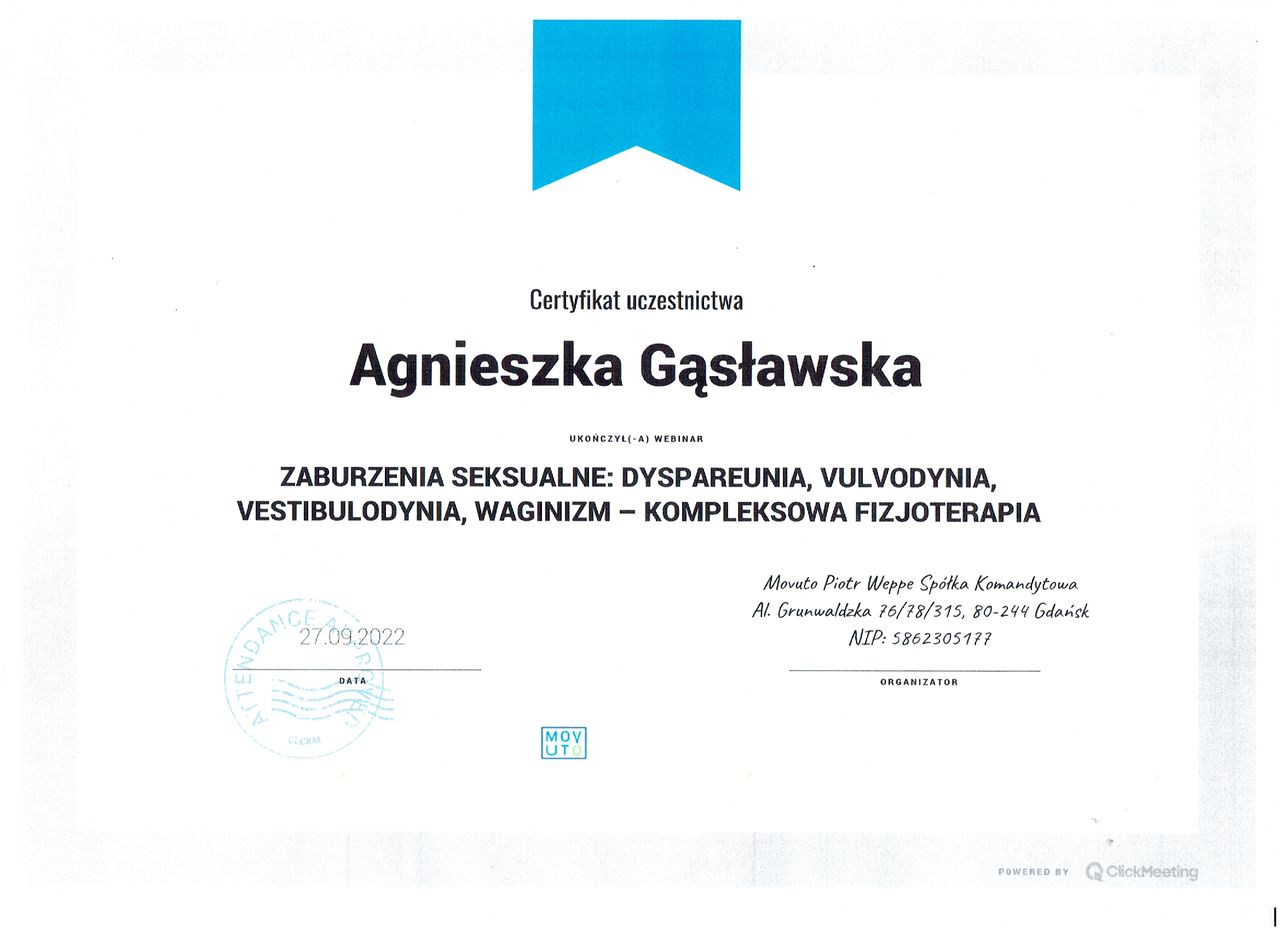 Jaki jest zakres porad oferowanych przez Agnieszka Gąsławska?Agnieszka Gąsławska to fizjoterapeuta. Na podstawie swojego doświadczenia i wykształcenia Agnieszka Gąsławska oferuje usługi takie jak: konsultacja fizjoterapeutyczna, fizjoterapia uroginekologiczna (pierwsza wizyta), fizjoterapia uroginekologiczna - bóle miesiączkowe i endometrioza, fizjoterapia uroginekologiczna - nietrzymanie moczu, fizjoterapia uroginekologiczna, fizjoterapia dna miednicy, fizjoterapia kobiet w ciąży / fizjoterapia okołoporodowa (pierwsza wizyta), Fizjoterapia po udarach w chorobach OUN, Fizjoterapia w domu pacjenta.