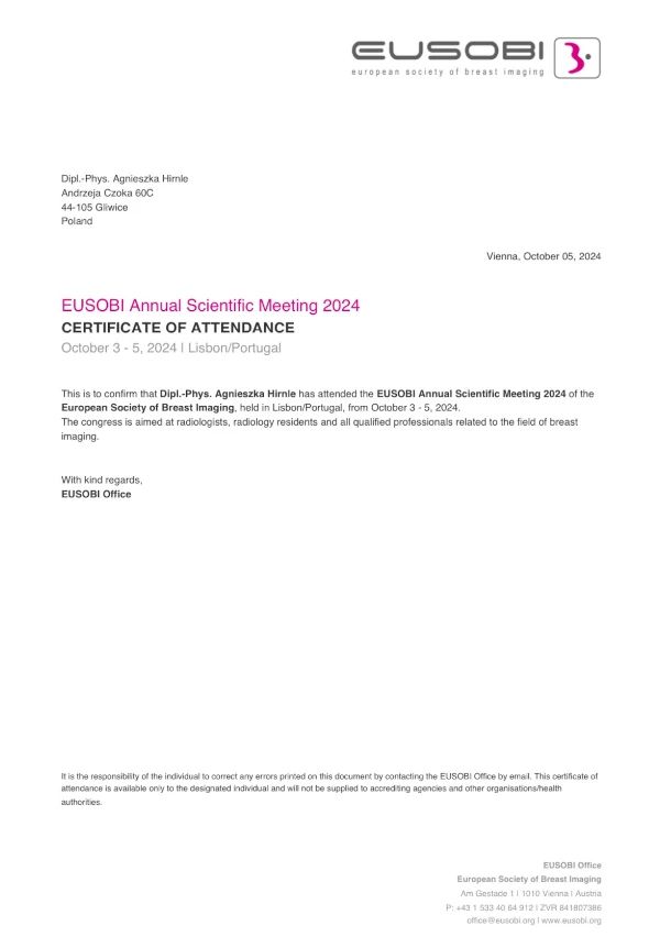 Zajmuję się przede wszystkim diagnostyką obrazową piersi, z zakresu której szkolę się na licznych kursach oraz konferencjach naukowych w kraju i zagranicą, a także biorę aktywny udział w konsyliach Breast Unit w NIO w Gliwicach.