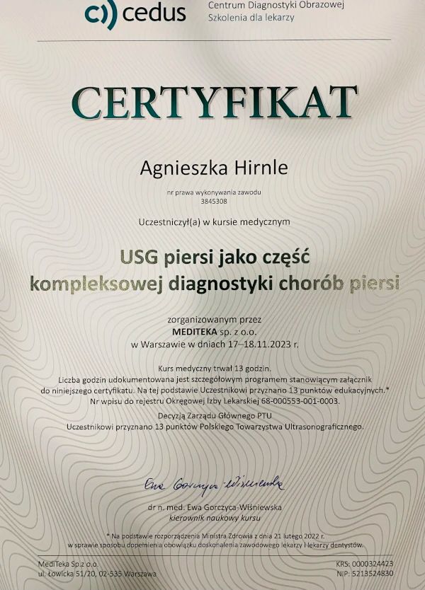 Jaki jest zakres porad oferowanych przez Agnieszka Hirnle?Agnieszka Hirnle to ultrasonografista. Na podstawie swojego doświadczenia i wykształcenia Agnieszka Hirnle oferuje usługi takie jak: USG, USG piersi, USG piersi dziecka, USG gruczołów sutkowych u mężczyzn i dzieci, USG jamy brzusznej, USG ślinianek, USG tarczycy, USG węzłów chłonnych, USG worka mosznowego, pakiet kontrolny USG dla mężczyzn (jama brzuszna, jądra, tarczyca).