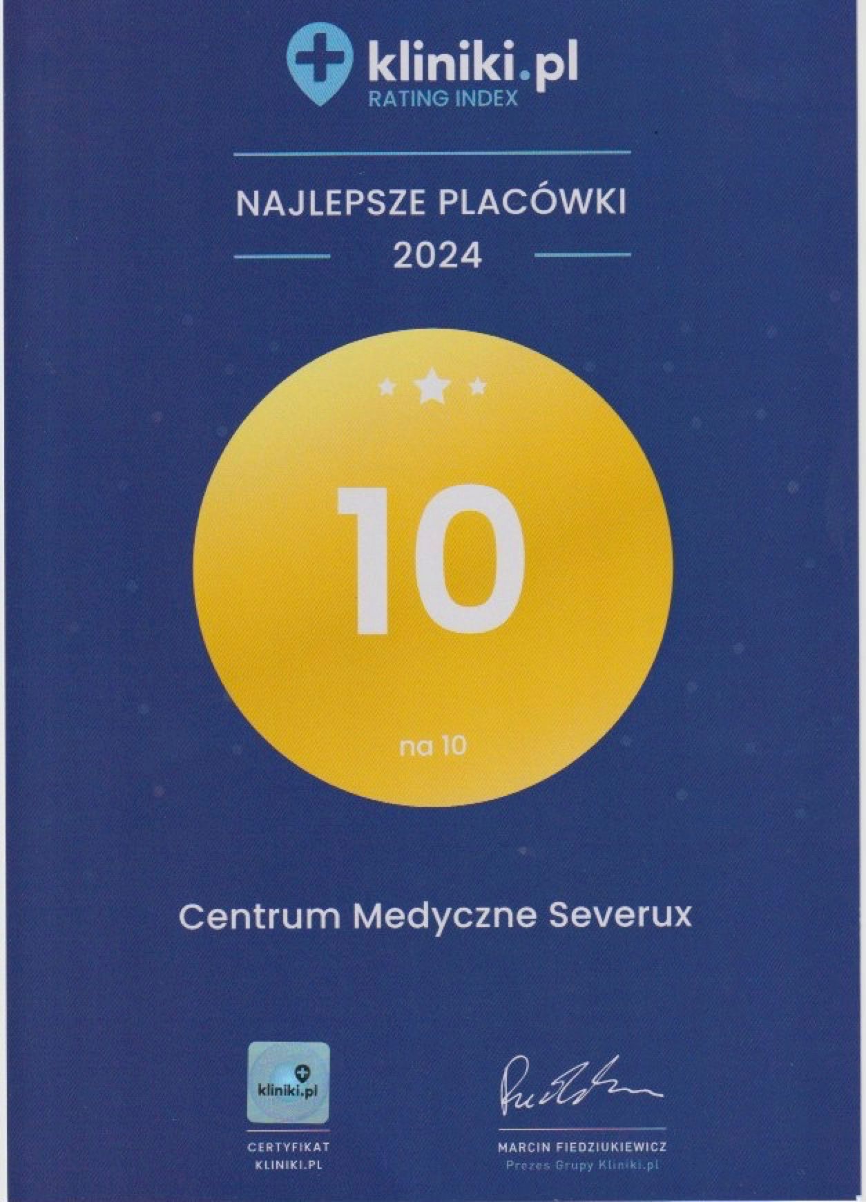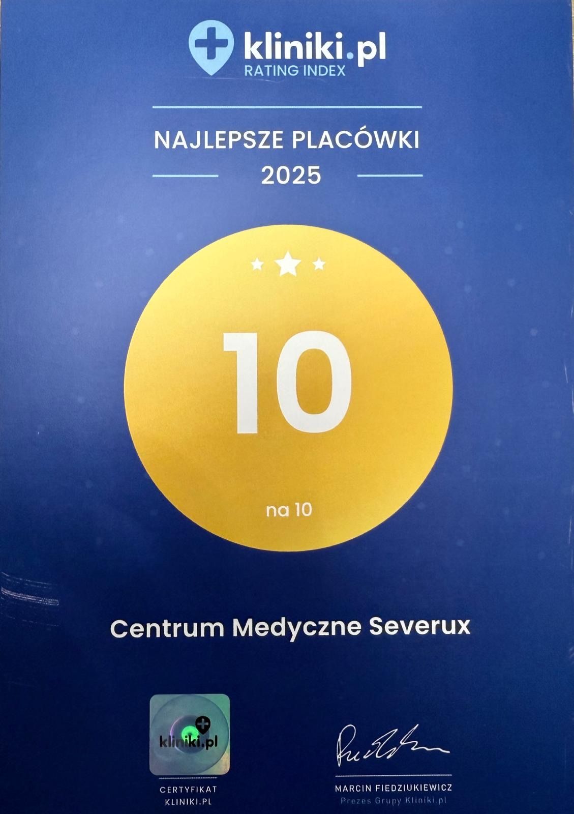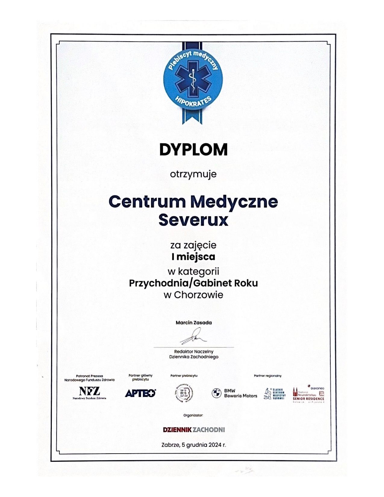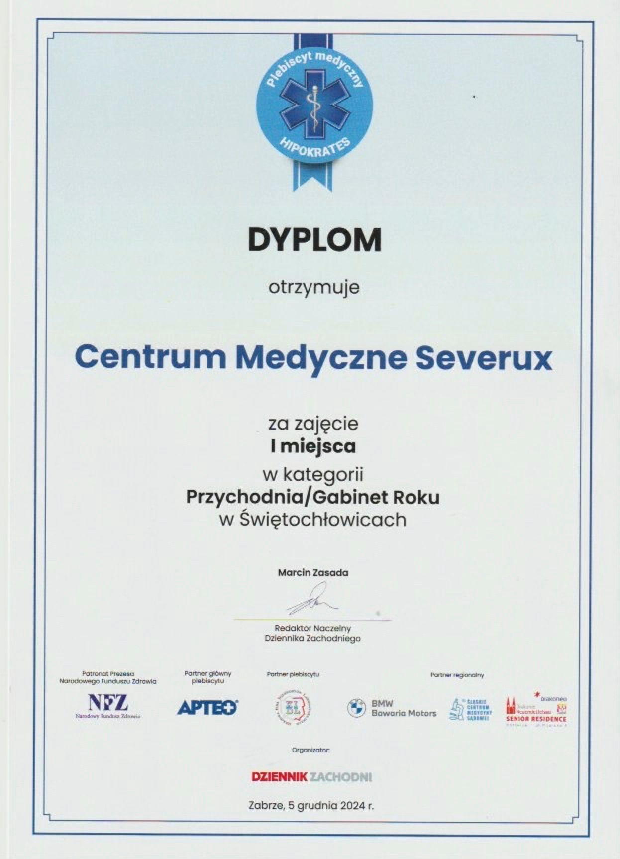 Centrum Medyczne Severux działa w ramach dwóch lokalizacji: w Chorzowie (ul. Katowicka 157) oraz w Świętochłowicach (ul. Sikorskiego 1), placówce znajdującej się bezpośrednio przy zjeździe z Drogowej Trasy Średnicowej. Zespół naszych specjalistów liczy ponad 100 osób i stale się powiększa. To fantastyczni ludzie - kompetentni i empatyczni, traktujący pacjenta z szacunkiem i troską. Znajdziesz u nas m.in. szybkie terminy konsultacji, aparaturę medyczną najwyższej jakości, umiarkowane ceny, łatwy dojazd i duży osobny parking. Zapraszamy do skorzystania z prywatnych konsultacji w następujących specjalnościach: alergologia, akupunktura, chirurgia naczyniowa i ogólna, dermatologia, diabetologia, dietetyka, endokrynologia, fizjoterapia, ginekologia, hematologia, interna, kardiologia, laryngologia, medycyna estetyczna, medycyna pracy, neurologia, okulistyka, onkologia, optometria, ortodoncja, ortopedia, pediatria, podologia, poradnia leczenia bólu, poradnia leczenia ran przewlekłych, poradnia leczenia stopy cukrzycowej, pracownia USG, psychiatria, psychologia, reumatologia, stomatologia i urologia. W placówce w Świętochłowicach działa też punkt pobrań oraz pracownia radiologii stomatologicznej. Do zobaczenia w CM Severux! :)