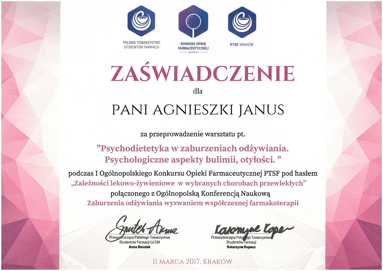 Nazywam się Agnieszka Janas i jestem absolwentką psychologii o profilu praktycznym na Uniwersytecie Jagiellońskim. Ukończyłam moduł specjalizacyjny z psychodietetyki oraz Studium Pedagogiczne UJ. Obecnie poszerzam swoją wiedzę na studiach podyplomowych z neuropsychologii. Na co dzień pracuję w jednym z krakowskich szpitali specjalistycznych, gdzie towarzyszę pacjentom w procesie leczenia. Moje doświadczenie zawodowe obejmuje również pracę w międzynarodowym przedszkolu, wsparcie dydaktyczne studentów z niepełnosprawnościami w ramach Centrum Dostępności uczelni wyższej, a także praktyki na oddziałach szpitalnych, w placówkach edukacyjnych i wychowawczych. Byłam także wolontariuszką na Oddziale Hematologii. W pracy kieruję się indywidualnym i holistycznym podejściem do każdej osoby. Tolerancja i empatyczne zrozumienie to dla mnie fundamenty budowania bezpiecznej przestrzeni do rozmowy, diagnozy i wspólnego planowania dalszych kroków. Wspieram dzieci, młodzież i dorosłych w rozwoju, w radzeniu sobie z trudnościami życiowymi oraz w poprawie jakości życia – zarówno w zdrowiu, jak i w chorobie.