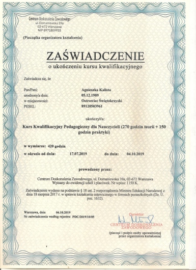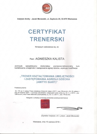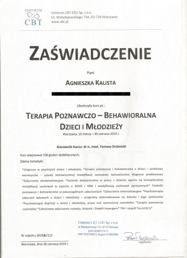 Zapraszam do zapisów przez recepcję placówki. Tel: Jestem psychologiem dziecięcym i psychoterapeutą poznawczo-behawioralnym w trakcie szkolenia. Posiadam uprawnienia do przeprowadzania badania ADOS-2 u dzieci i osób dorosłych. Od lat zajmuję się pracą z dziećmi i nastolatkami w poradniach psychologicznych, psychologiczno-pedagogicznych oraz placówkach terapeutycznych i opiekuńczych. W pracy kładę nacisk na zbudowanie relacji z pacjentem, opartej na zaufaniu i akceptacji, których potrzebuje każdy młodszy i starszy człowiek. Taki punkt wyjścia sprawia, że podjęte działania terapeutyczne są bardziej efektywne a pacjenci bardziej zmotywowani do współpracy. Podczas diagnozy staram się dać rodzicom jak najpełniejszą informację zwrotną, odnośnie sposobów pomocy małemu człowiekowi. Praca terapeutyczna z trudnościami dziecka, to również praca nad całym systemem rodzinnym – udzielam wskazówek i porad dla rodziców, jak wspierać dziecko w procesie zmiany. Pomagam: - zdiagnozować problemy - przeżyć bezpiecznie żałobę - wzmocnić swoją motywację - zmienić swoje zachowanie - nauczyć się lepiej rozumieć i nazywać swoje emocje i potrzeby - uporać się z trudnymi dla siebie myślami - poprawić swoje relacje z innymi ludźmi - nauczyć się bardziej efektywnej komunikacji z innymi - nauczyć się wyrażać swoje oczekiwania wobec innych - podjąć ważne decyzje i kolejne kroki w życiu - poradzić sobie z doświadczaną przemocą w domu - rozwinąć swoje umiejętności społeczne - poradzić sobie z uzależnieniem - poradzić sobie z traumą Oferuję wsparcie dla rodziców, którzy starają się zrozumieć swoje dzieci i pomóc im w zaspokojeniu ich potrzeb rozwojowych. Zapraszam również osoby, które chcą skonsultować niepokojące zachowania swojego dziecka, pomóc im w przezwyciężeniu trudności społecznych lub edukacyjnych, a także dzieci przeżywające zmiany życiowe, takie jak rozwód, choroba czy żałoba, i potrzebujące odpowiedniego wsparcia. Moje dotychczasowe doświadczenie zdobywałam jako: -Psycholog w Ośrodku Środowiskowej Opieki Psychologicznej i Psychoterapeutycznej dla Dzieci i Młodzieży – Diagnoza psychologiczna oraz poradnictwo psychologiczne -Psycholog w Warszawski Szpital dla Dzieci – Ocena rozwoju psychoruchowego małego dziecka, diagnostyka zaburzeń neurorozwojowych, konsultacje rodzicielskie, prowadzenie zajęć grupowych TUS -Psycholog oraz terapeuta Integracji Sensorycznej w Niepublicznej PPP – Diagnoza i terapia psychologiczna dzieci, diagnoza i terapia Integracji Sensorycznej dzieci -Psycholog w publicznym żłobku – obserwacja i wstępna diagnoza zaburzeń u dzieci, poradnictwo psychologiczne dla rodziców, prowadzenie zajęć rozwijających dla dzieci -Konsultant na linii wsparcia w Instytut Psychologii Zdrowia – Interwencja kryzysowa w Telefonie Zaufania 116 123 dla Osób Dorosłych w Kryzysie Emocjonalnym -Stażystka w Centrum Terapii Mutyzmu, Nieśmiałości i Lęku – Terapia grupowa dla dzieci z mutyzmem wybiórczym -Stażystka w Sekcja Psychologów w Wojewódzkiej Komendzie Policji w Kielcach – prowadzenie szkoleń dla pracowników Policji, prowadzenie wywiadów z funkcjonariuszami