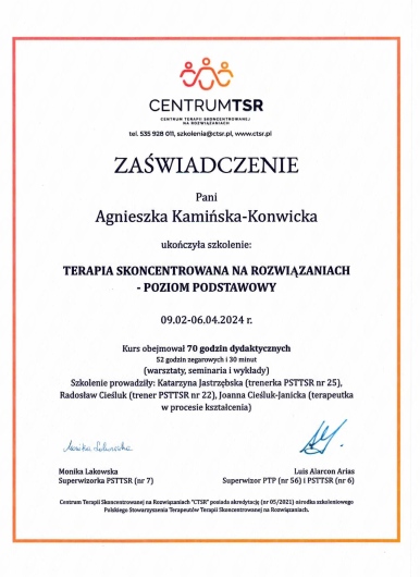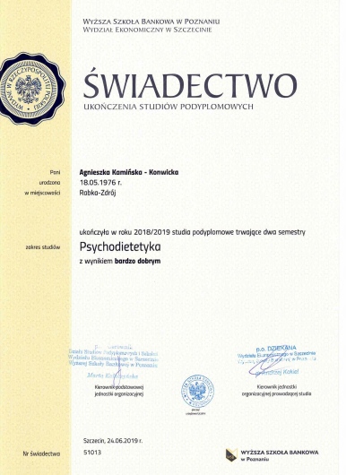Nazywam się Agnieszka Kamińska-Konwicka, jestem dyplomowanym psychologiem o specjalności klinicznej, psychodietetykiem oraz terapeutą w trakcie procesu certyfikacji.