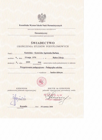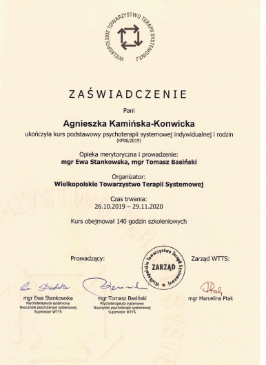 W pracy wykorzystuję wiedzę zdobytą w trakcie studiów, zarówno jednolitych magisterskich i podyplomowych, ale także podczas szkoleń z zakresu Rodzinnej Terapii Systemowej i TSR (Terapii Skoncentrowanej na Rozwiązaniach). Na bieżąco podnoszę swoje kwalifikacje i poszerzam wiedzę poprzez udział w kursach, szkoleniach i konferencjach, pracuję pod stałą superwizją.