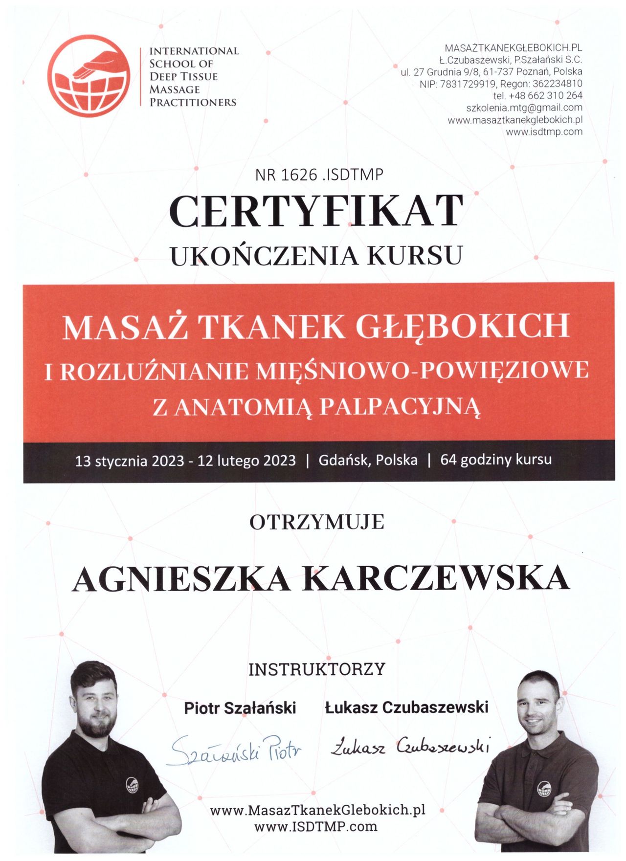 W swojej pracy łączę holistyczne podejście z nowoczesnymi metodami, wykorzystując m.in. masaż tkanek głębokich oraz techniki wypracowane podczas licznych kursów i praktyki klinicznej.