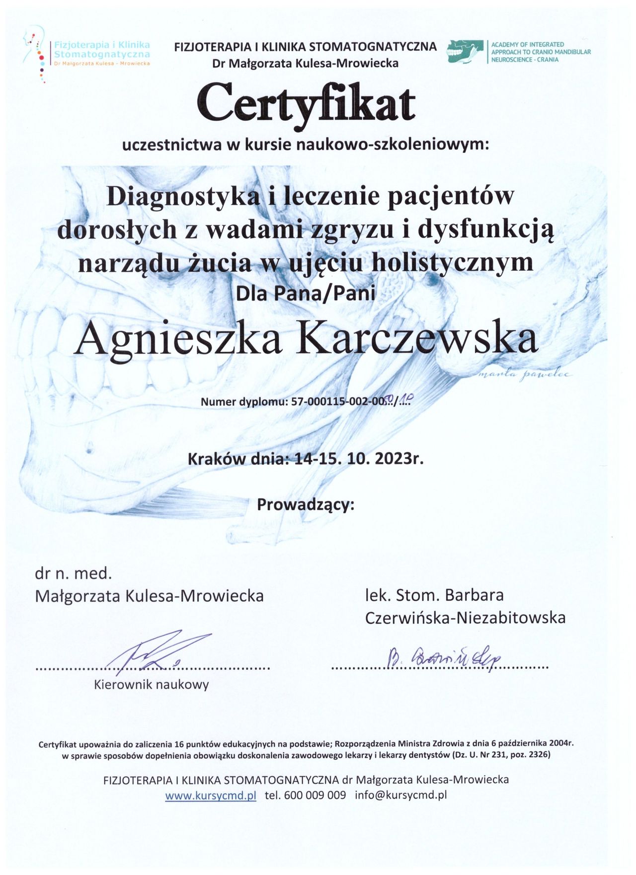 Jestem fizjoterapeutką specjalizującą się w fizjoterapii stomatologicznej oraz uroginekologicznej (w trakcie akredytacji Polskiego Towarzystwa Uroginekologicznego). Pomagam osobom z dolegliwościami stawów skroniowo-żuchwowych, bólami głowy, karku i szyi, a także pacjentkom z problemami w obrębie dna miednicy (między innymi w ciąży i po porodzie).