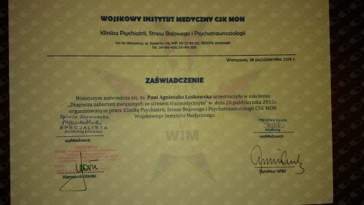 Chcąc zapewnić Państwu jak najwyższą jakość świadczonych usług wciąż podnoszę swoje kwalifikacje zawodowe poprzez uczestnictwo w specjalistycznych kursach oraz szkoleniach. Dbając o dobro pacjenta i rzetelność świadczonych usług swoją pracę opieram na zasadach Kodeksu Etyczno - Zawodowego Psychologa.
