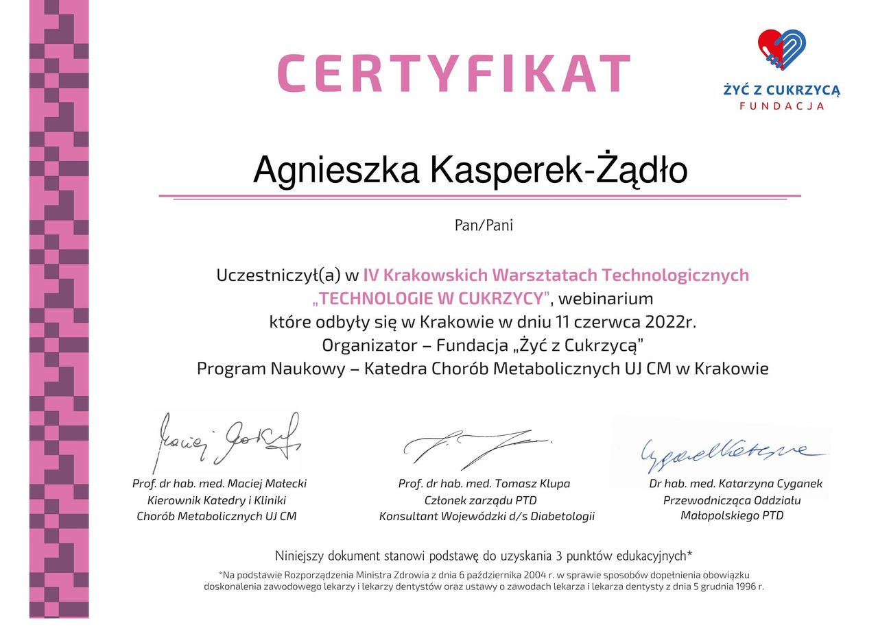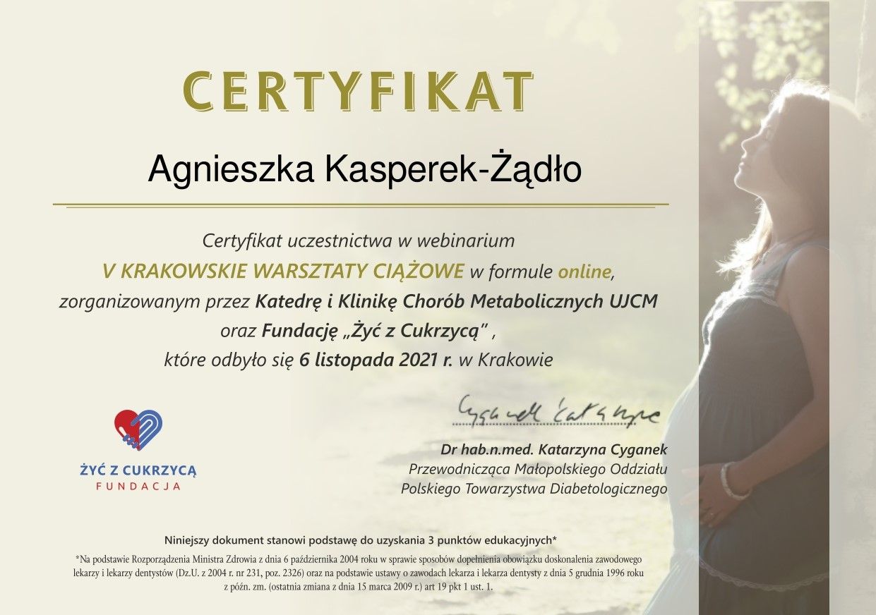 Posiadam certyfikat Polskiego Towarzystwa Badań nad Otyłością. Jestem członkiem Polskiego Towarzystwa Diabetologicznego oraz Polskiego Towarzystwa Leczenia Otyłości(PTLO).