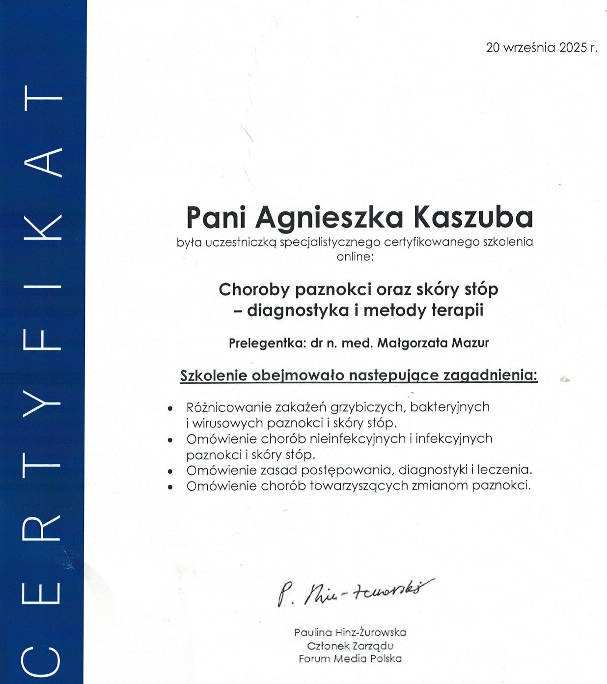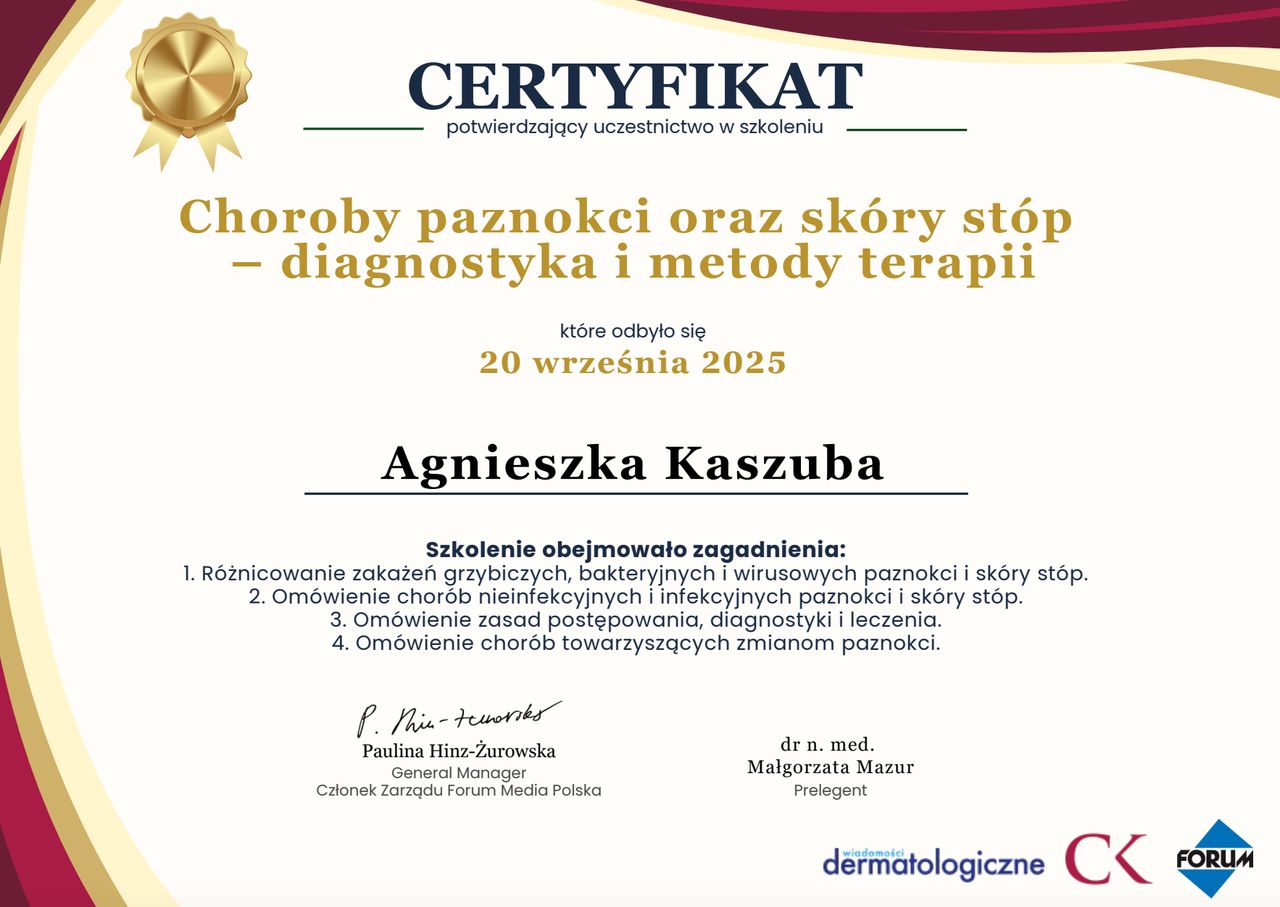 Jestem przede wszystkim podologiem z wykształceniem medycznym, a samorozwój to moja codzienność. Wierzę, że człowiek uczy się całe życie. Kocham ludzi i dbam o to, by w moim gabinecie czuli się bezpiecznie, zrozumiani i akceptowani - bez oceniania, z pełnym szacunkiem.