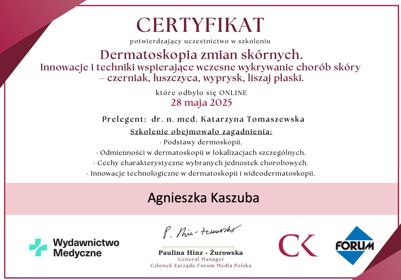 Polecam ten gabinet a Pani Agnieszka jest profesjonalna i zaangarzowana podczas konsultacji !!!