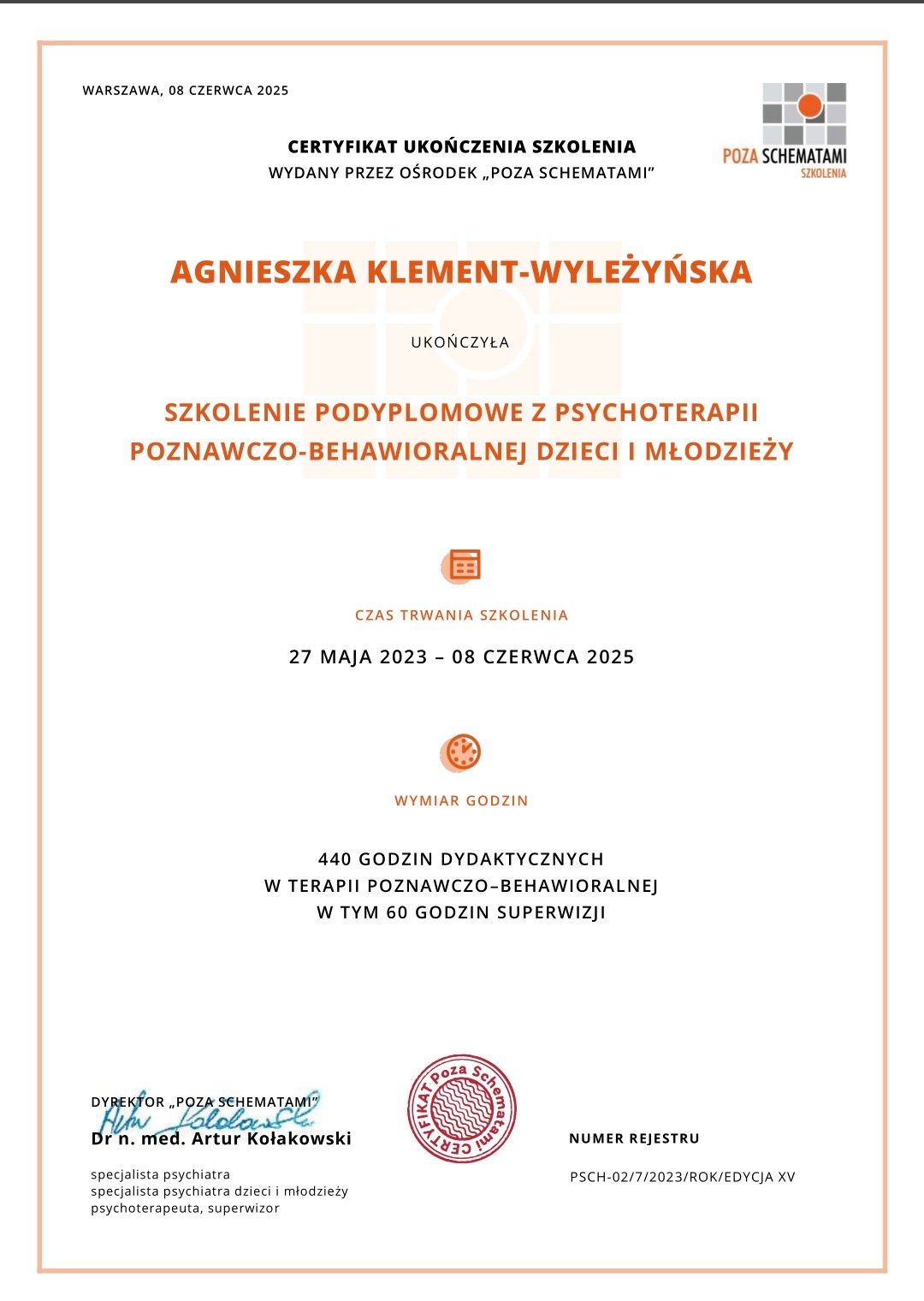 Jaki jest zakres porad oferowanych przez Agnieszka Klement-Wyleżyńska?Agnieszka Klement-Wyleżyńska to psycholog dziecięcy, psycholog. Na podstawie swojego doświadczenia i wykształcenia Agnieszka Klement-Wyleżyńska oferuje usługi takie jak: Konsultacja psychologiczna, terapia psychologiczna dla dzieci i młodzieży, konsultacja psychologiczna (pierwsza wizyta), interwencja kryzysowa, Diagnoza ADHD dzieci i młodzieży.