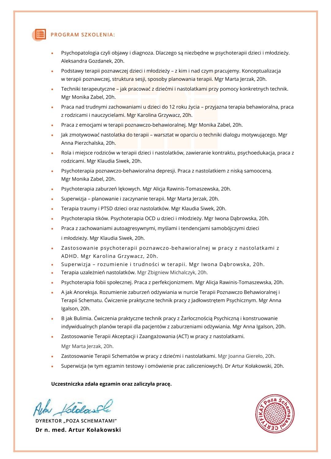 Moim celem jest udzielenie profesjonalnego wsparcia dla dziecka i jego rodziny. Dlatego też nieustannie szkolę się, podnosząc swoje kwalifikacje, aby móc jak najlepiej pomagać moim klientom. Swoją pracę poddaję regularnej superwizji. Pracuję z zgodnie z wytycznymi Kodeksu Etyczno-Zawodowego Psychologa.