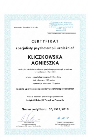 Jaki jest zakres porad oferowanych przez Agnieszka Kliczkowska?Agnieszka Kliczkowska to psycholog, psychoterapeuta certyfikowany. Na podstawie swojego doświadczenia i wykształcenia Agnieszka Kliczkowska oferuje usługi takie jak: konsultacja online, psychoterapia indywidualna, psychoterapia uzależnień, konsultacja psychoterapeutyczna, Konsultacja psychologiczna.