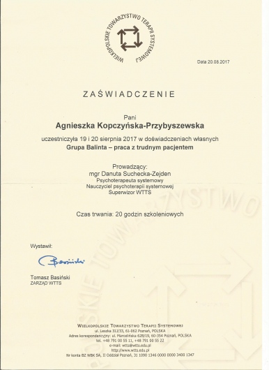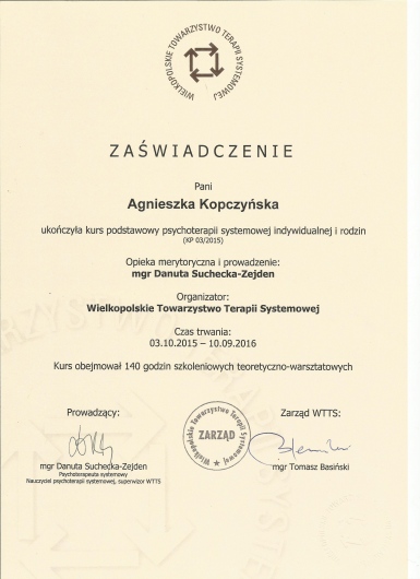 Członkiem Wielkopolskiego Towarzystwa Terapii Systemowej.
