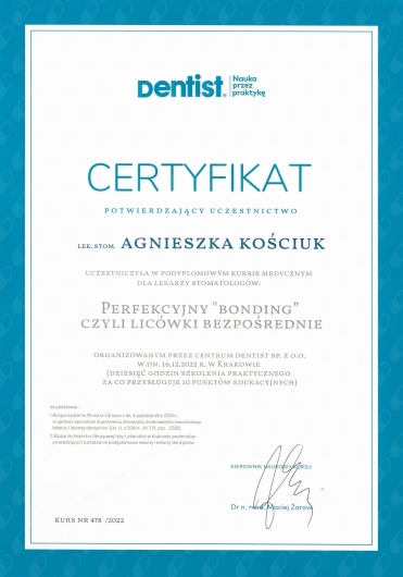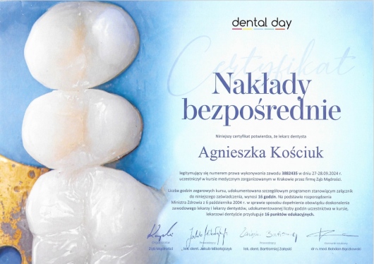 Jaki jest zakres porad oferowanych przez Agnieszka Kościuk?Agnieszka Kościuk to stomatolog. Na podstawie swojego doświadczenia i wykształcenia Agnieszka Kościuk oferuje usługi takie jak: wypełnienie kompozytowe, wizyta w związku z bólem zęba, Stomatologia zachowawcza, leczenie próchnicy, badania stomatologiczne, Konsultacja stomatologiczna, Odbudowa zęba na włóknie szklanym.