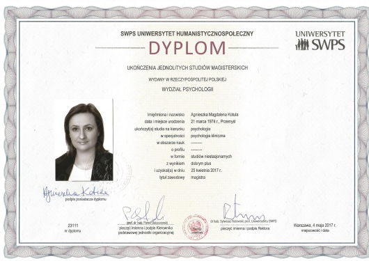 Ukończyłam 5 - letnie jednolite studia magisterskie na kierunku psychologia kliniczna na Uniwersytecie SWPS, 4 - letnie studia podyplomowe w Szkole Psychoterapii Poznawczo - Behawioralnej Uniwersytetu SWPS (nr certyfikatu: 1481) oraz roczne studia podyplomowe na kierunku psychodietetyka na Uniwersytecie SWPS, a także 1,5 - roczne studium nauczycielskie MBSR (Mindfulness Based Stress Reduction) w Polskim Instytucie Mindfulness. Ta ostatnia kompetencja predysponuje mnie do pracy w tzw. 3 fali CBT, czyli w terapiach opartych właśnie na mindfulness (uważności). Specjalizuję się w dwóch: ACT (Acceptance Commitment Therapy- Terapia Akceptacji i Zaangażowania) oraz ST (Schema Therapy-Terapia Schematów) - ukończyłam zaawansowane szkolenie przygotowujące do certyfikatu ISST. Należę do Polskiego Towarzystwa Terapii Poznawczo - Behawioralnej (PTTPB). Doświadczenie zawodowe zdobywałam podczas stażu klinicznego w Specjalistycznym Psychiatrycznym Oddziale opieki Zdrowotnej im. prof. Antoniego Kępińskiego w Jarosławiu. Obecnie przyjmuję w gabinecie prywatnym, a swoją pracę poddaję regularnej superwizji u superwizorów rekomendowanych przez PTPPB. Dbam o stały rozwój swoich kompetencji, uczestnicząc regularnie w specjalistycznych szkoleniach i konferencjach.