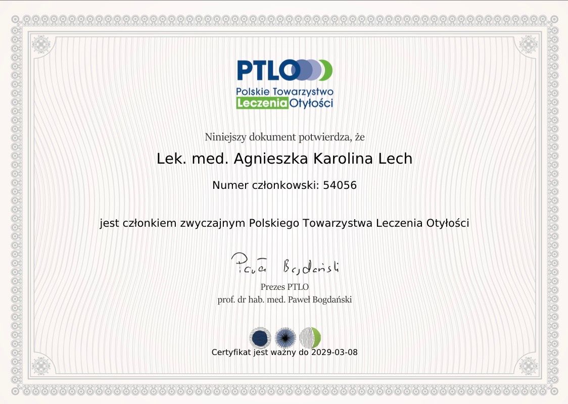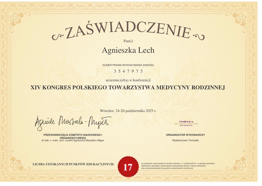 Jestem absolwentką Śląskiego Uniwersytetu Medycznego, z ukończoną specjalizacją z zakresu medycyny rodzinnej. Jako członkini Polskiego Towarzystwa Medycyny Rodzinnej oraz Polskiego Towarzystwa Leczenia Otyłości regularnie aktualizuję i poszerzam swoją wiedzę, uczestnicząc w konferencjach i szkoleniach. W opiece nad pacjentami kieruję się aktualną wiedzą medyczną i kompleksowym podejściem do problemów chorego.