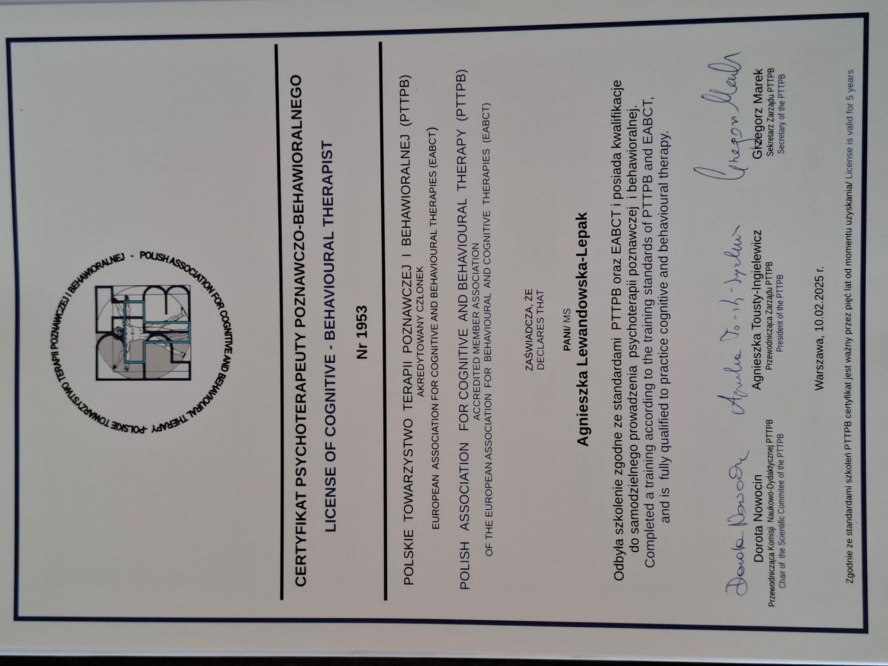 Polecam Pani Agnieszka jest bardzo profesjonalna i empatyczna.Rozmawiając z Nią czuję się tak jak byśmy znały się już bardzo długo. Potrafi słuchać jest przy tym bardzo czujna i uważna robi notatki na każde spotkanie jest przygotowana. Z każdej wizyty można wynieść jakiś wniosek oraz techniki radzenia sobie z problemem Patrzy całościowo, stara się pomóc na każdej płaszczyźnie ,podpowiada możliwe rozwiązania problemu Pomogła mi poukładać i zrozumieć wiele spraw Dziękuję i gorąco polecam